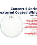 The Concert 5â„¢ is a coated, 5mil single-ply drumhead designed specifically for symphonic and light snare drum applications. With its sensitive, articulate response, it is perfect for performances that require nuanced and precise snare sounds. The Z100 texture coating enhances the warmth and resonance, providing a rich tone that cuts through in orchestral settings.